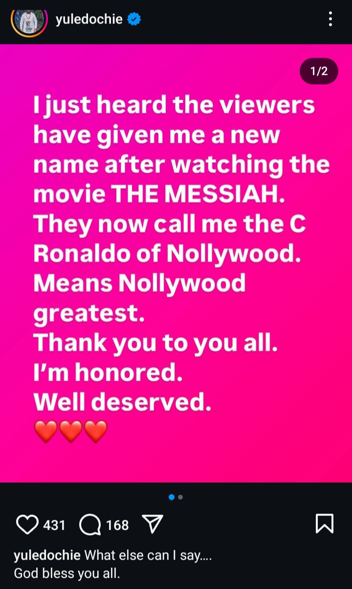 “I just heard the viewers have given me a new name after watching the movie THE MESSIAH. They now call me the C Ronaldo of Nollywood. Means Nollywood greatest.