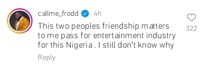 “This two people’s friendship matters to me pass for the entertainment industry for this Nigeria. I still don’t know why,” he stated.