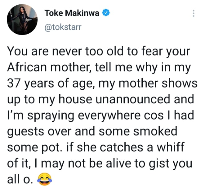 “You are never too old to fear your African mother, tell me why in my 37 years of age, my mother shows up to my house unannounced and I’m spraying everywhere cos I had guests over and some smoked some pot. if she catches a whiff of it, I may not be alive to gist you all o. 😂”