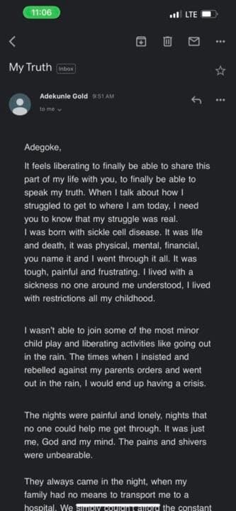 “I was born with sickle cell disease. It was life and death, it was physical, mental, financial, you name it and I went through it all. It was tough, painful and frustrating. I lived with a sickness no one around me understood, I lived with restrictions all my childhood.