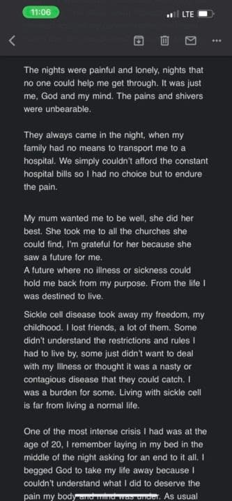Living with sickle cell is far from living a normal life. One of the most intense crisis I had was at the age of 20, I remember laying in my bed in the middle of the night asking for an end to it all. I begged God to take my life away because I couldn’t understand what I did to deserve the pain my body and mind was under.