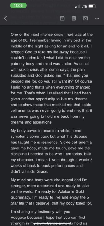 My body caves in once in a while, some symptoms come back but what this disease has taught me is resilience. Sickle cell anemia gave me hope, made me tough, gave me the discipline I needed to be who I am today, built my character. I mean I went through a whole 5 weeks of back to back performances and didn’t fall sick.”