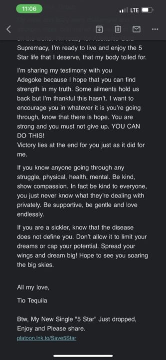 The 35-year-old crooner made this disclosure in a lengthy letter to his fans, on Friday, July 15, where he recounted his plights after being born with Sickle Cell Anemia.