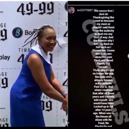 “The reason that I don’t do thanksgiving like I used to because my mom or should I say, Kemi have the audacity to treat me any kind of way. And the reason why I turn my back on her cos she don’t care about her own flesh and blood family, but herself. That’s why I am still no longer her son.