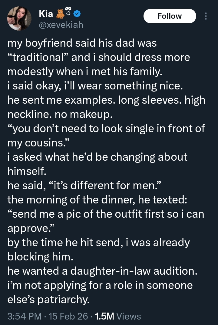The lady, who posted on X (formerly Twitter), accused her boyfriend of trying to control her appearance ahead of a family dinner. Her post has since sparked thousands of reactions online.