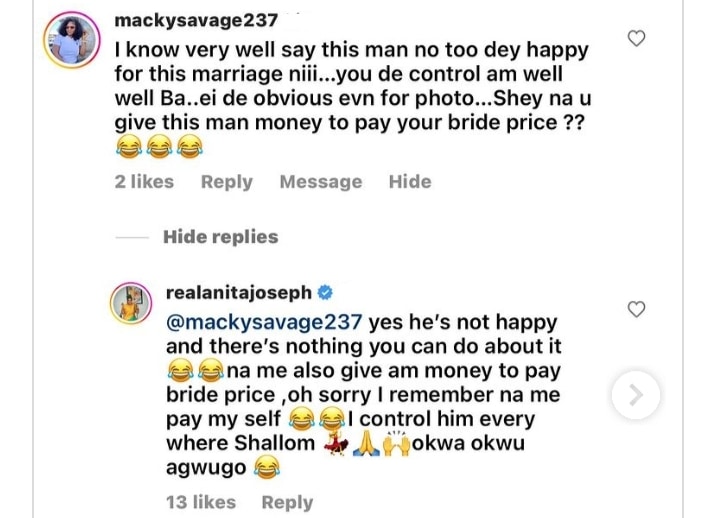 “Yes he’s not happy and there’s nothing you can do about it. Na me also give am money to pay bride price. Oh sorry I remember na me pay my self. I control him everywhere Shallom. Okwa Okwu agwugo”, the actress replied.