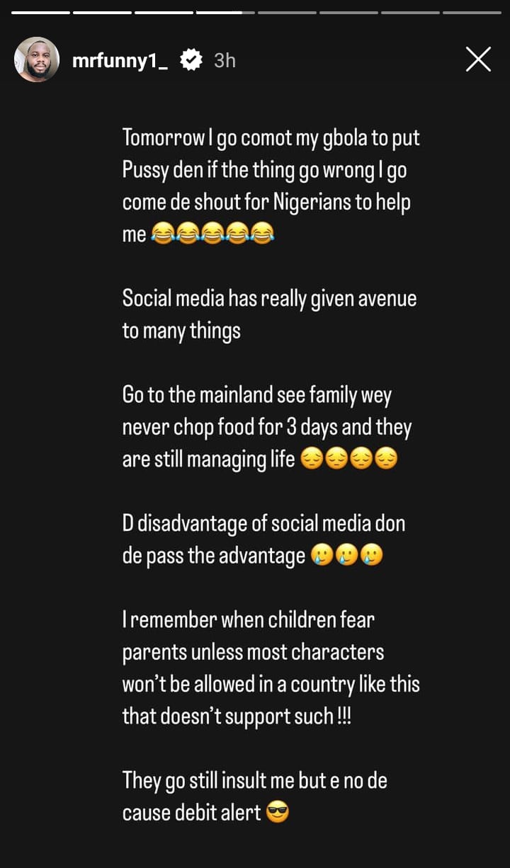 “Tomorrow I go comotmy gbola to put Psy den if the thing go wrong I go come de shout for Nigerians to help Social media has really given avenue to many things Go to the mainland see family Wey never chop food for 3 days and they are still managing life D disadvantage of social media don de pass the advantage I remember when children fear parents unless most characters won’t be allowed in a country like this that doesr{t support such !!! They go still insult me but e no de cause debit alert.”