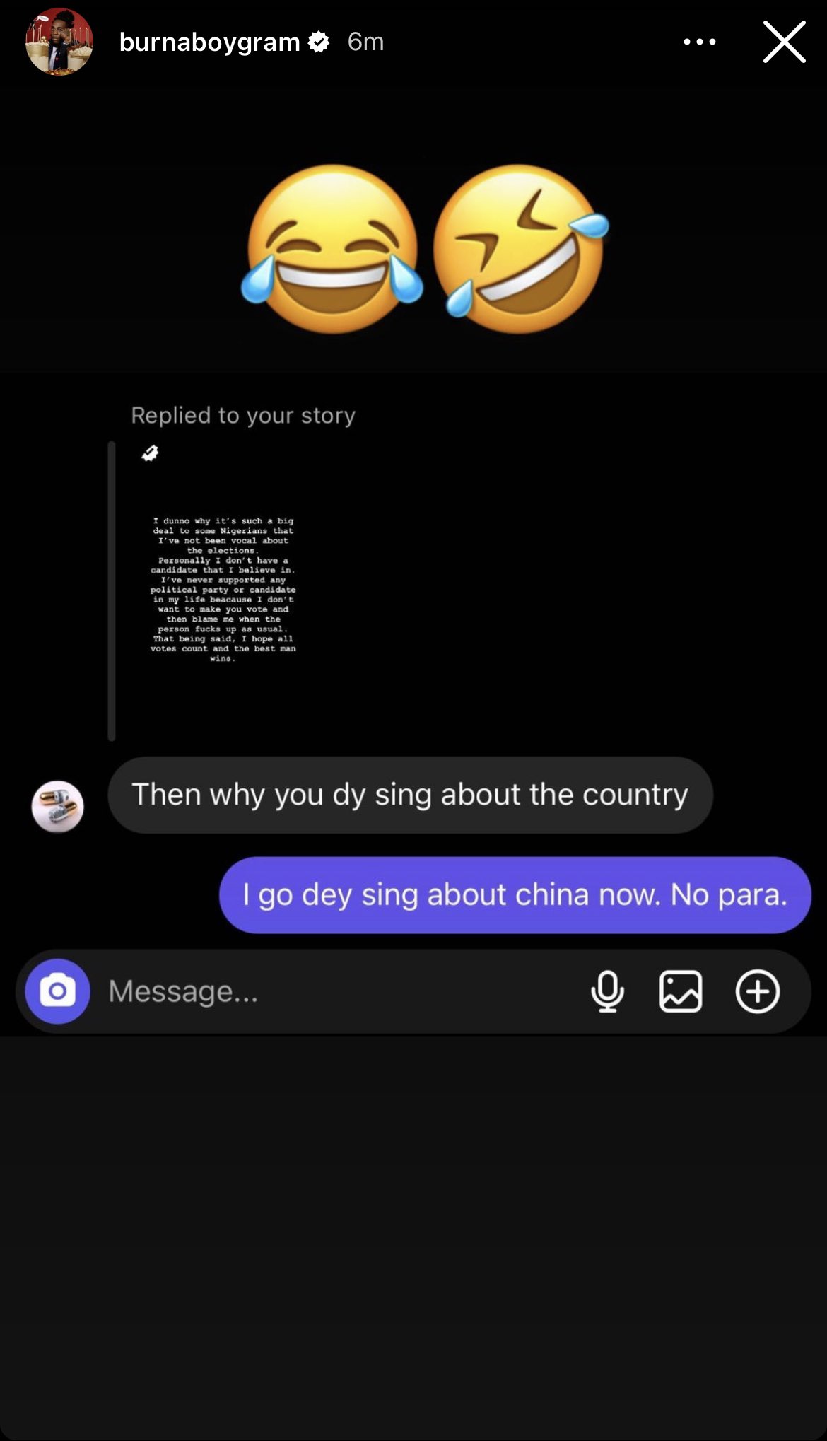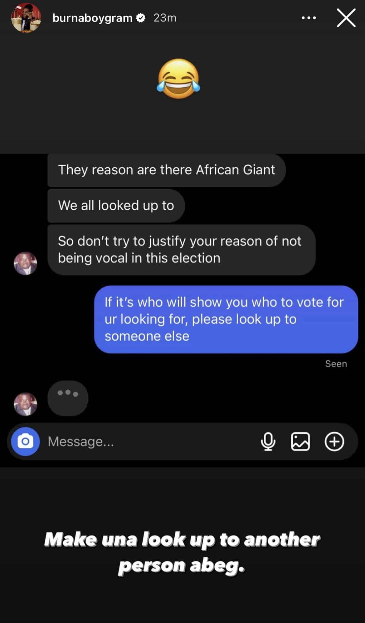 Burna pressed on to share some reactions from his followers who ridiculed his justifications. A social media user rubbished him for not pointing out a party for his fans to support.