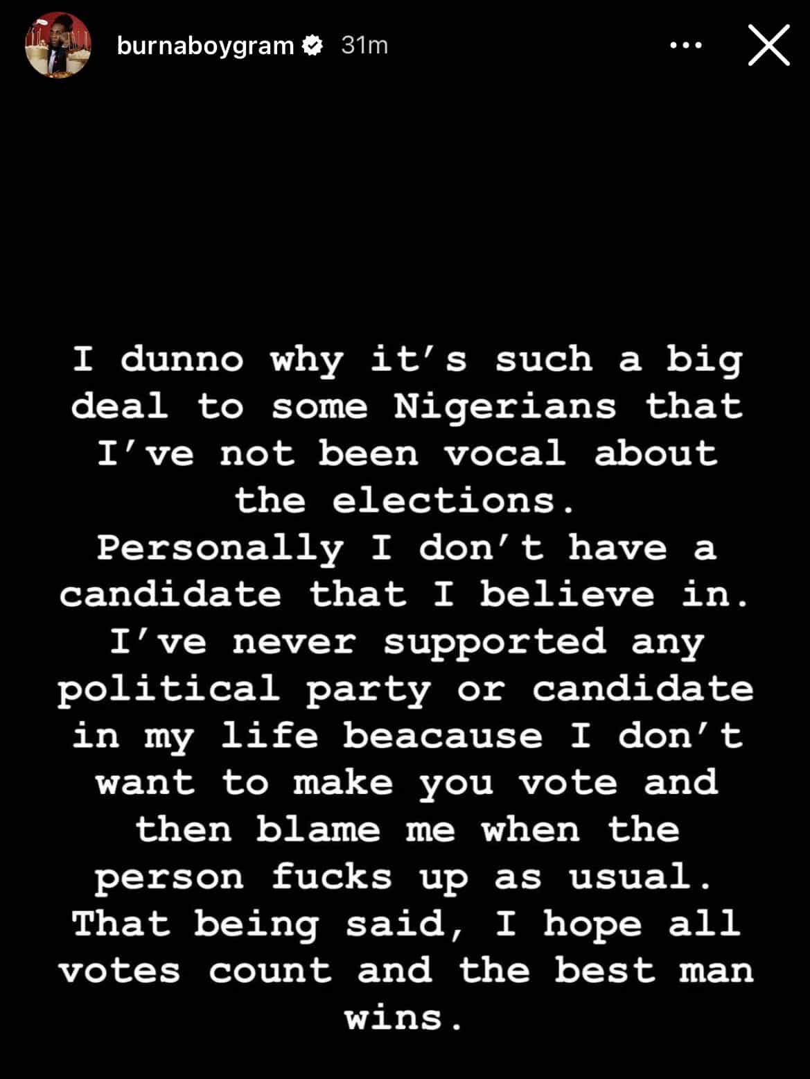 Grammy award-winning singer, Burna Boy, breaks silence on why he has been silent on the ongoing 2023 presidential elections.