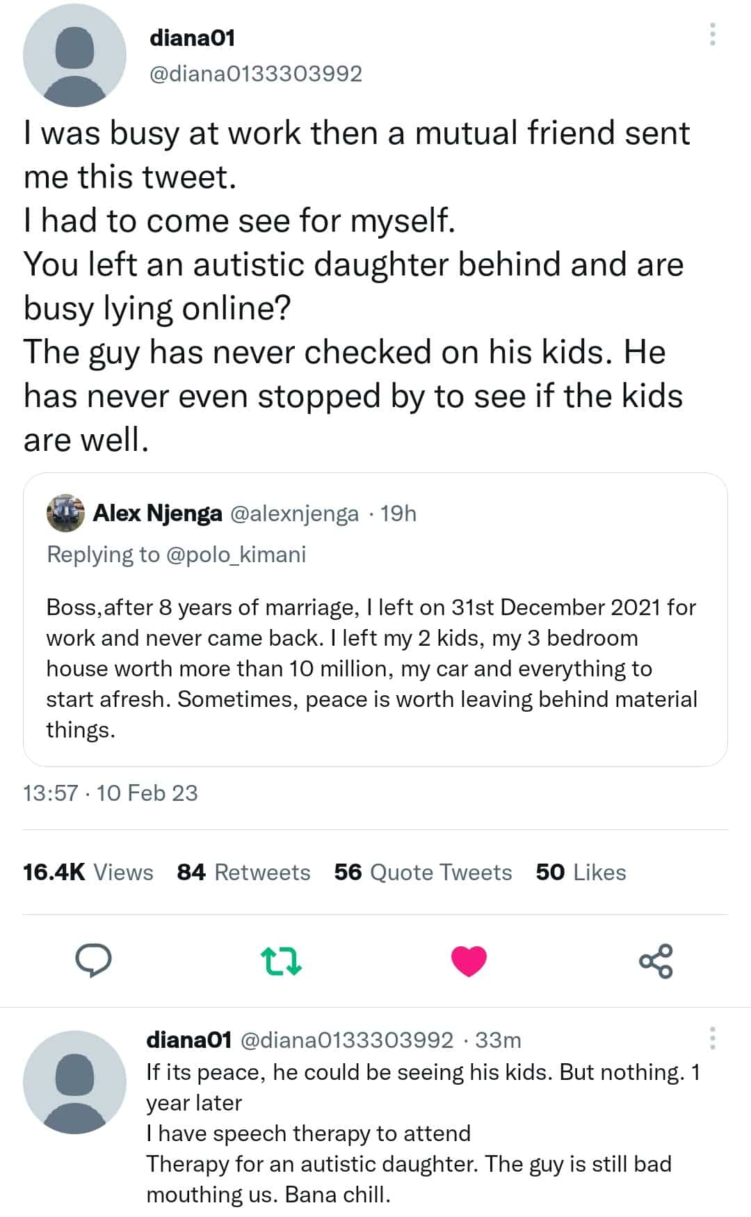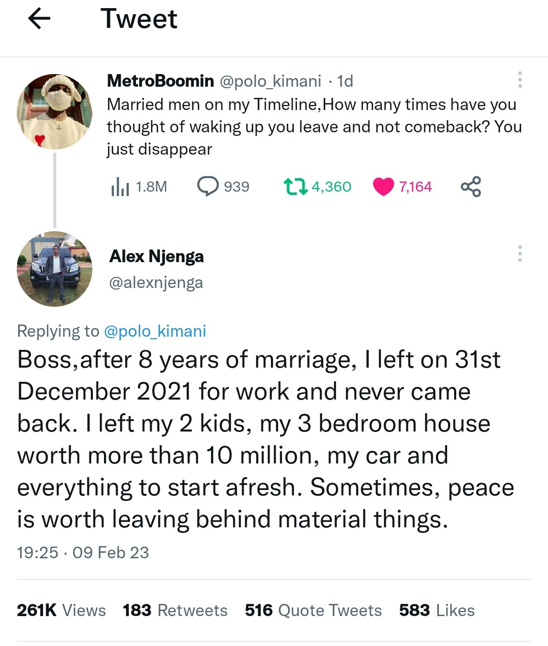 “Boss, after 8 years of marriage, I left on 31st December 2021 for work and never came back. I left my 2 kids, my 3 bedroom house worth more than 10 million, my car and everything to start afresh. Sometimes, peace is worth leaving behind material things,” he tweeted.