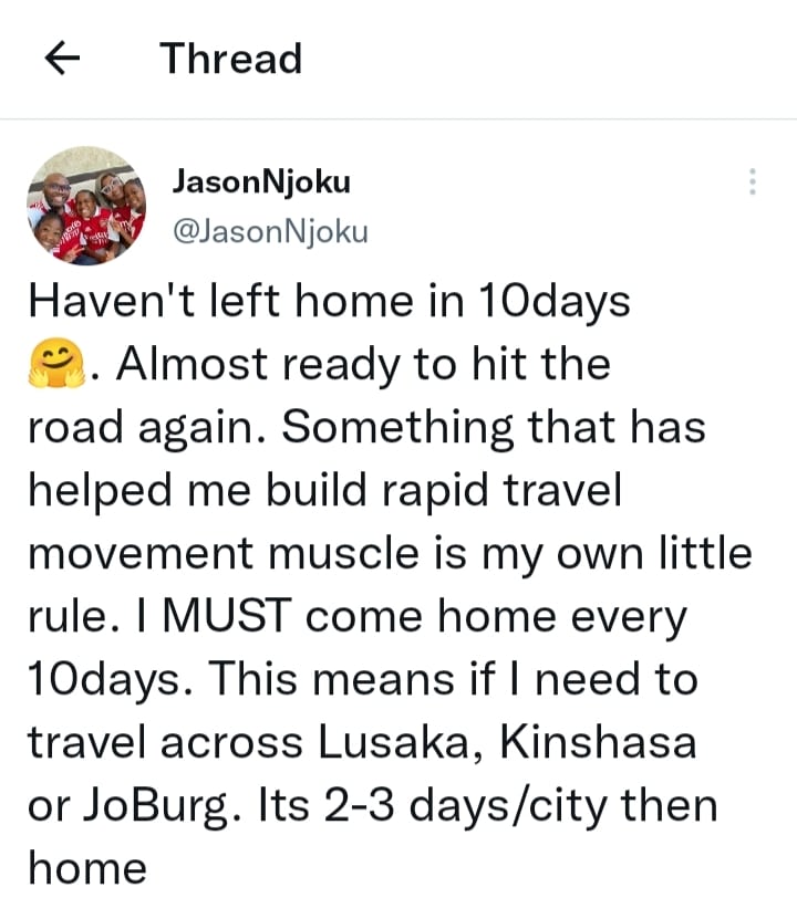 “Haven’t left home in 10days🤗. Almost ready to hit the road again. Something that has helped me build rapid travel movement muscle is my own little rule. I MUST come home every 10days. This means if I need to travel across Lusaka, Kinshasa or JoBurg. Its 2-3 days/city then home.