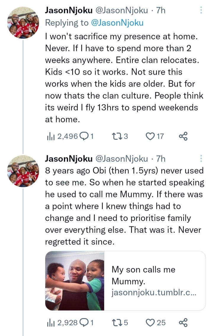 “8 years ago Obi (then 1.5yrs) never used to see me. So when he started speaking he used to call me Mummy. If there was a point where I knew things had to change and I need to prioritise family over everything else. That was it. Never regretted it since.”