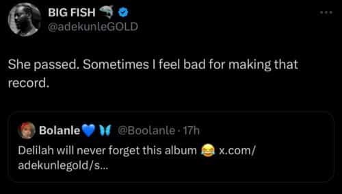 Adekunle Gold replied by saying, “She passed. Sometimes I feel bad for making that record,”