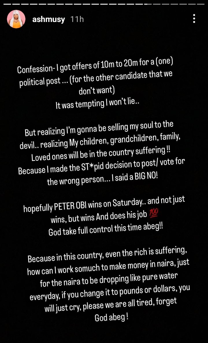 She confessed that she had been approached with an offer of 10 to 20 million naira to make a political advert endorsing a particular candidate that nobody likes.
