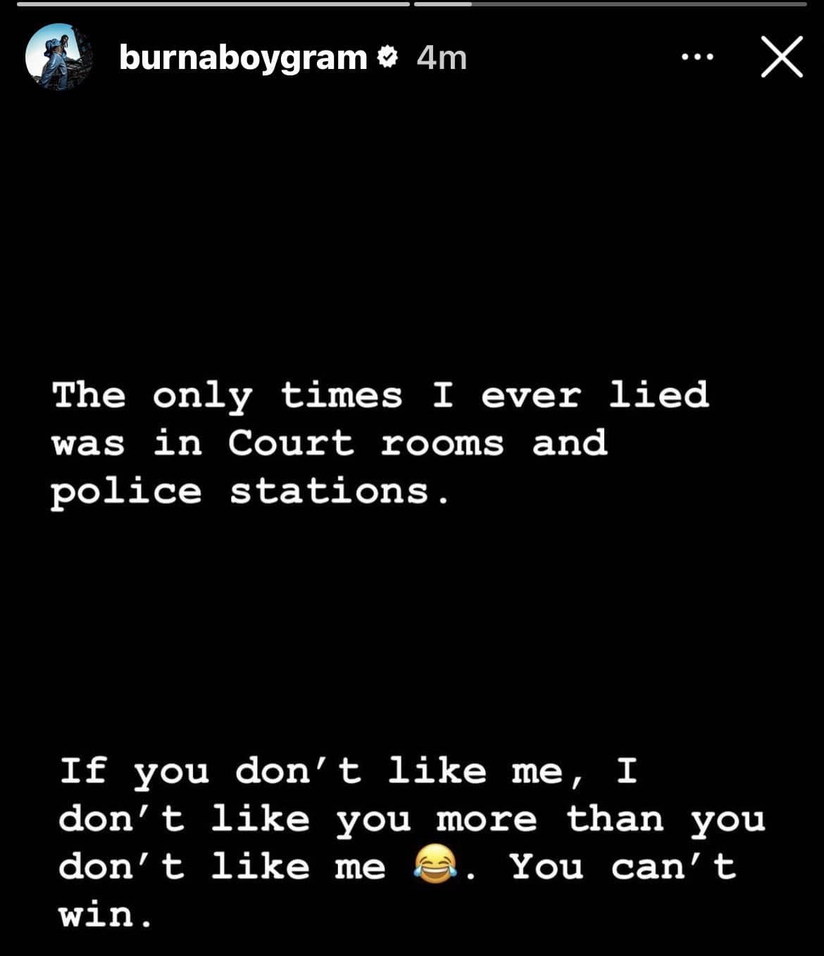 Burna Boy added that he shares an equal resentment for anyone who does not like him or his personality; hence, the lie in court.