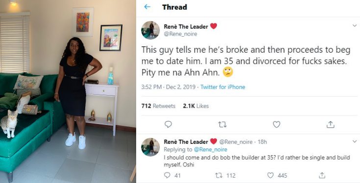 “This guy tells me he’s broke and then proceeds to beg me to date him. I am 35 and divorced for fucks sakes. Pity me na Ahn Ahn. I should come and do bob the builder at 35? I’d rather be single and build myself. Oshi”, she tweeted.
