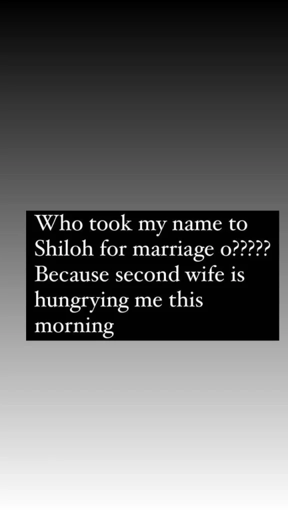 ”Who took my name to Shiloh for marriage o??? Because second wife is hungrying me this morning,” he wrote.