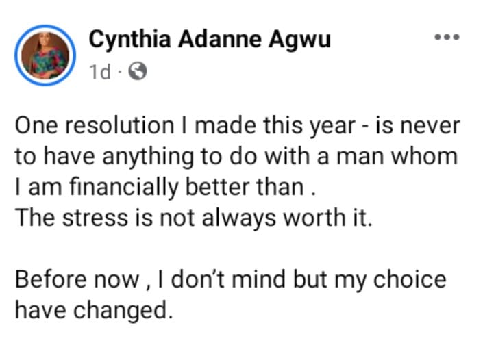 “One resolution I made this year – is never to have anything to do with a man whom I am financially better than. The stress is not always worth it. Before now I don’t mind but my choice has changed,” she wrote.