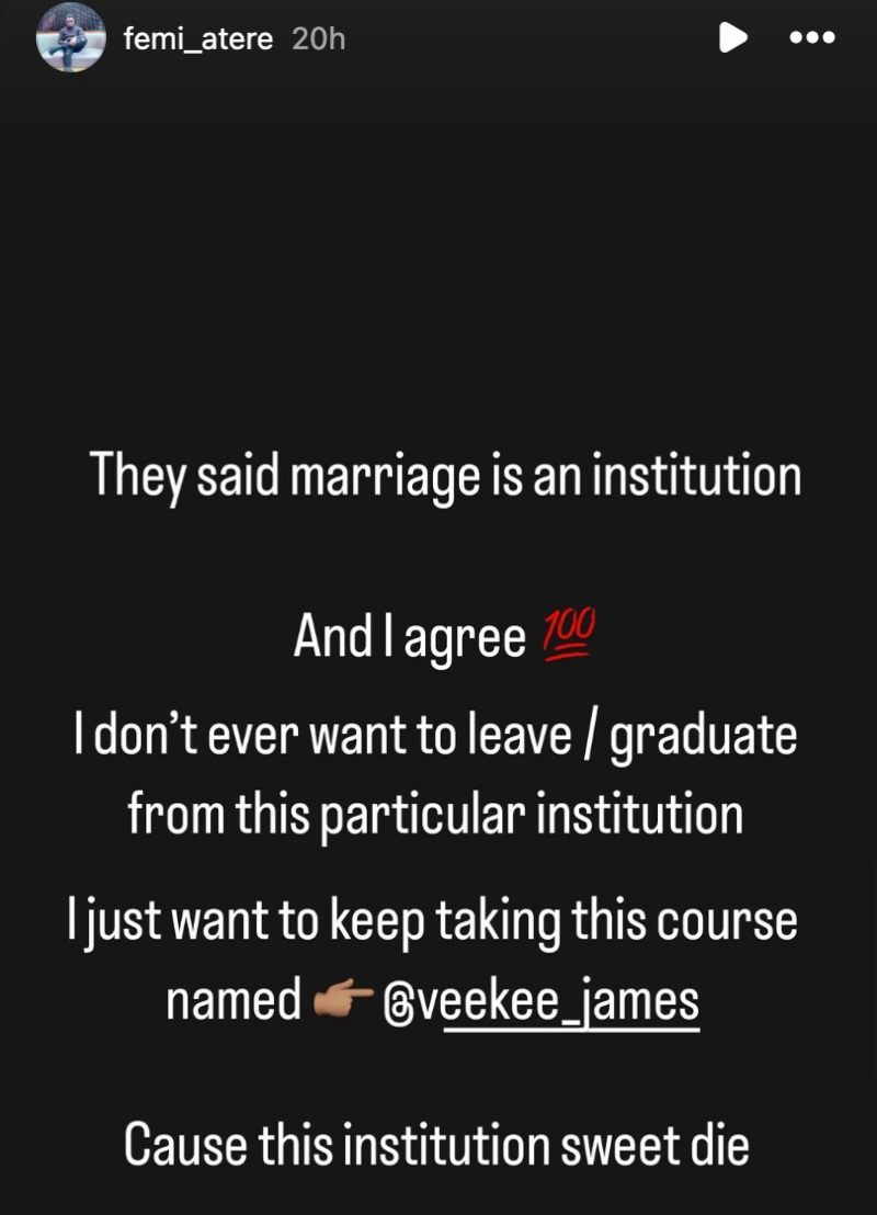 “They said marriage is an institution, and I agree 💯. I don’t ever want to leave or graduate from this particular institution. I just want to keep taking this course named ©veekee_james because this institution sweet die,” he wrote.