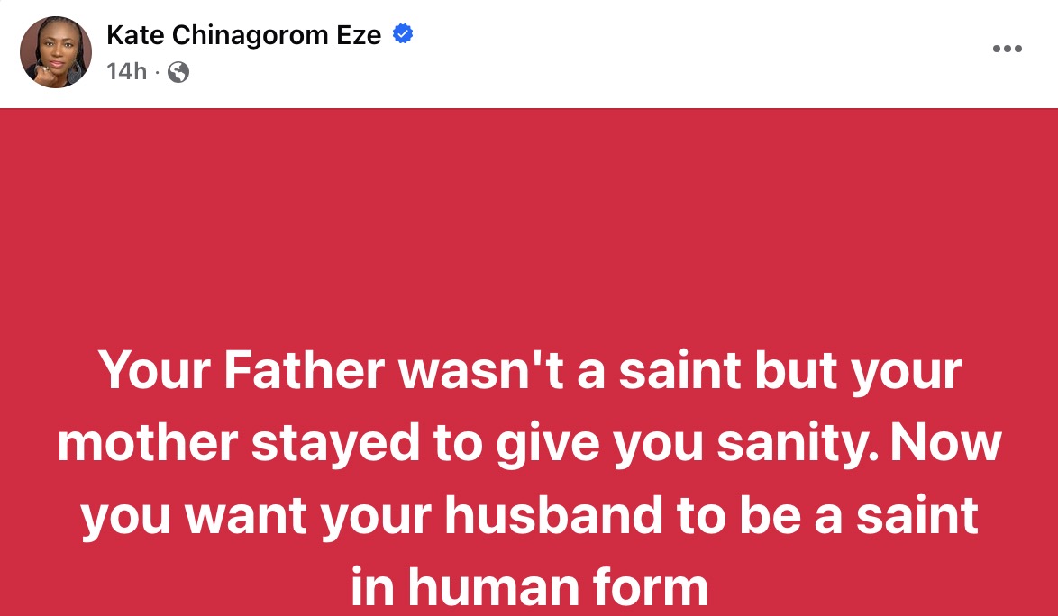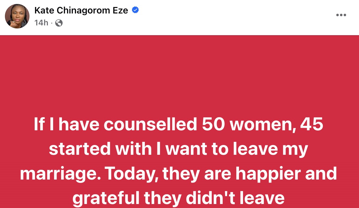 Taking to Facebook on Thursday, January 16, Eze addressed critics who questioned her glowing account of her marriage while taking jabs at women who leave their relationships due to infidelity or marital conflicts.