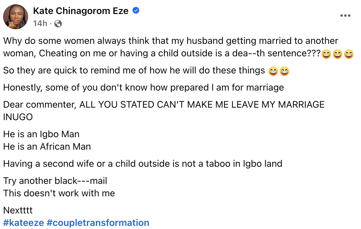 A Nigerian woman, Kate Chinagorom Eze, has sparked mixed reactions after declaring that she would not leave her marriage if her husband marries a second wife or fathers a child outside their union.