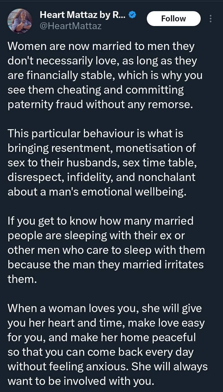 A recent post by a woman on X (formerly Twitter) has sparked widespread discussion about marriage, love, and fidelity in modern relationships.