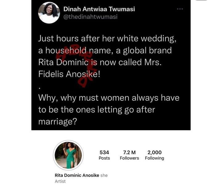 According to Dina Twumasi, a global brand, Rita Dominic, after her marriage would have to be called Miss Fidelis Anosike.