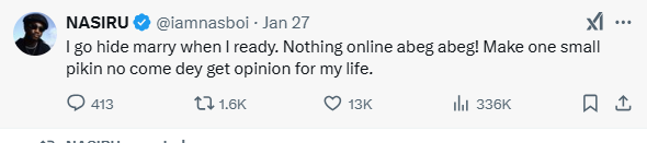 Notable singer and content creator, Nasboi has revealed his plans to keep his future marriage private.