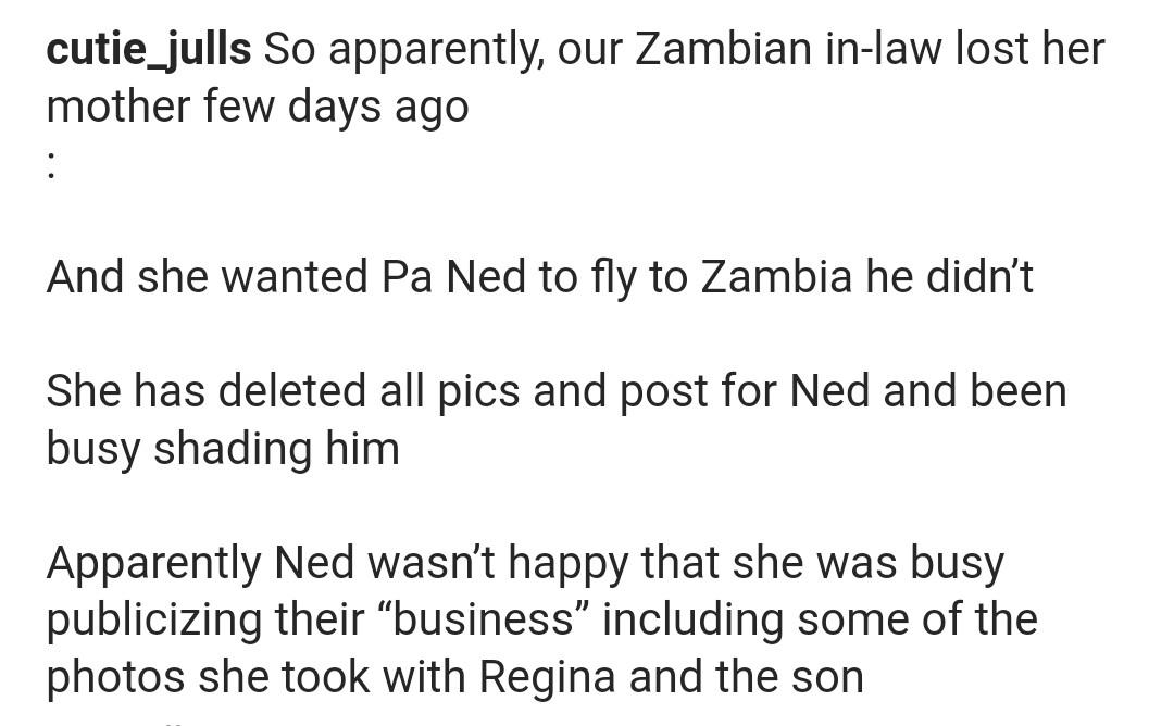 According to blogger, Cutie Julz, his alleged Zambian mistress lost her mother and she wanted Ned Nwoko to fly over to Zambia but he didn’t.