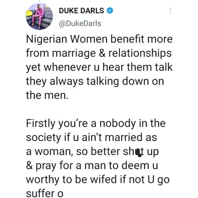 Nigerian women benefit more from marriage & relationships yet whenever u hear them talk they always talking down on men. Firstly you’re a nobody in the society if u ain’t married as a woman, so better shut up & pray for a man to deem u worthy to be wifed if not u go suffer o.