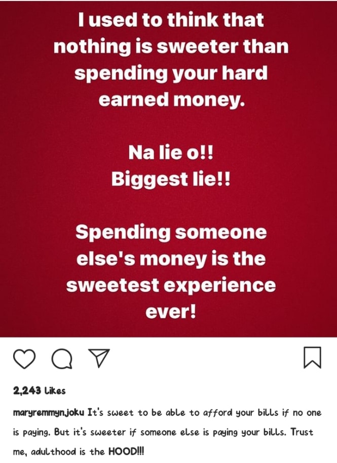 Her post reads: “I used to think that nothing is sweeter than spending your hard earned money. Na lie o!! Biggest lie!! Spending someone else’s money is the sweetest experience ever!”