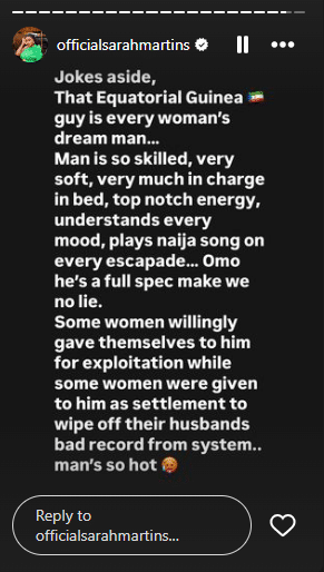 “Jokes aside, That Equatorial Guinea guy is every woman’s dream man… Man is so skilled, very soft. very much in charge in bed, top notch energy, understands every mood, plays naija song on every Omo he’s a full spec make we no lie.