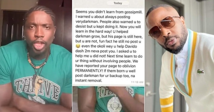 One of the messages reads: “Seems you didn’t learn from gossipmill. I warned u about always posting verydarkman. People also warned u to desist but u kept doing it. Now you will learn in the hard way! U helped darkman grow, but his page is still here, but u are not, fun fact he still no post u e even the okoli wey u help Davido dash 2m neva post you. I asked u to help me u did not! Next time learn to do ur thing without involving people. We have reported your page to oblivion PERMANENTLY! If them born u well post darkman for ur backup too, na instant removal.”