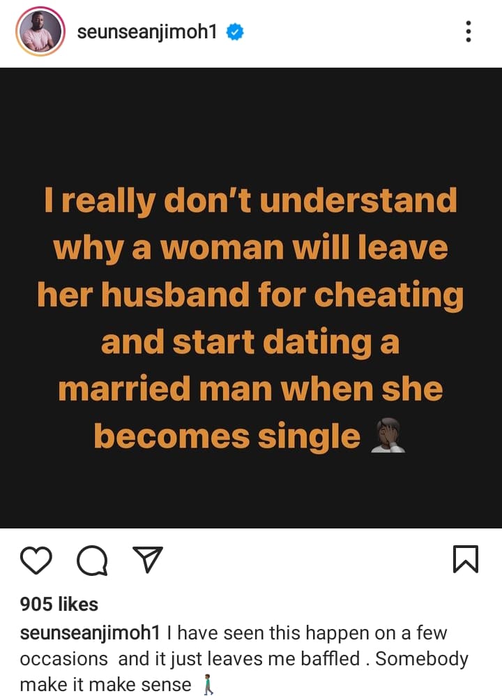 “I really don’t understand why a woman will leave her husband for cheating and start dating a married ma when she becomes single