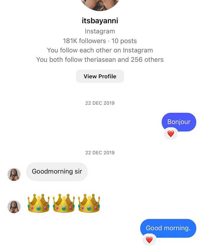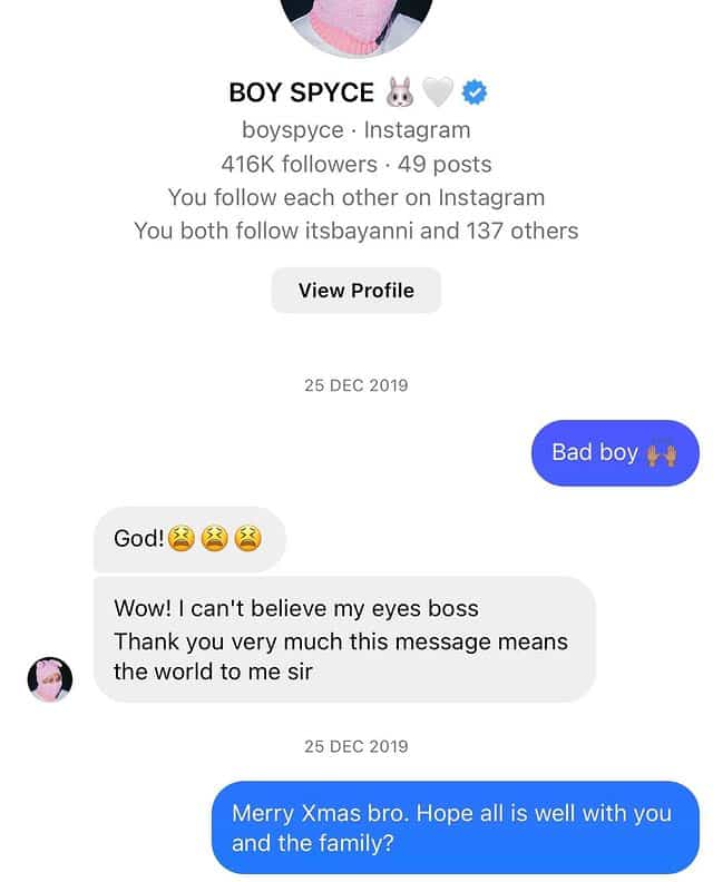 Don Jazzy also shared screenshots of his first messages with some of his artists – Ayra star, Boy Spyce, and the recently signee, Bayanni.