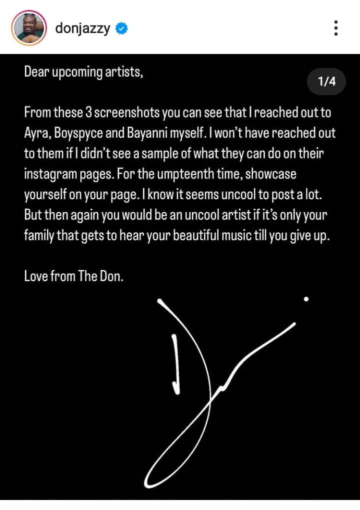 Why you need to showcase yourself on your page – Don Jazzy pens open letter to upcoming artists, shares first chats with some of his artists