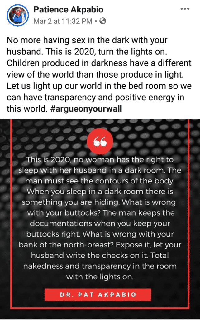 “No more having sex in the dark with your husband. This is 2020, turn the lights on. Children produced in darkness have a different view of the world than those produce in light. Let us light up our world in the bed room so we can have transparency and positive energy in this world. #argueonyourwall,” she wrote.