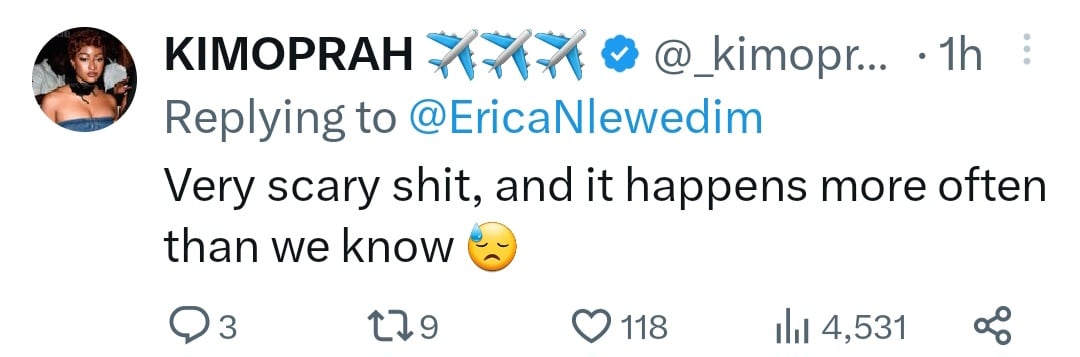 Erica’s colleague, Kim Oprah also reacted saying, “Very scary shit, and it happens more often than we know.”