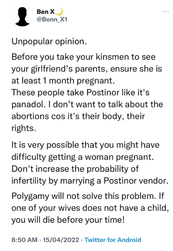 “Unpopular opinion. Before you take your kinsmen to see your girlfriend’s parents, ensure she is at least 1 month pregnant. These people take Postinor like it’s panadol.