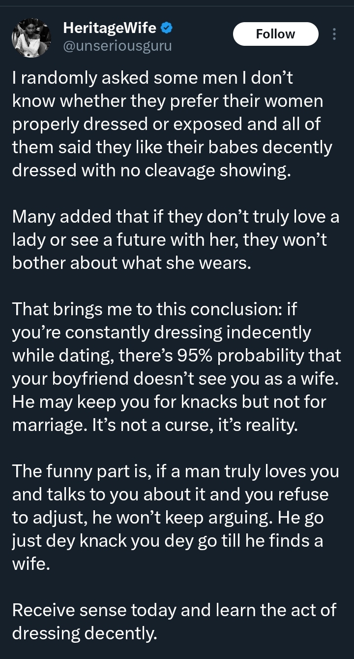 A Nigerian lady has stirred conversation online after sharing her views on how dressing may influence a man’s intentions in relationships.