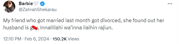 According to @ZahrahShekarau her friend had only gotten married a month ago when she found out that the man she married is gaayy and she had to take measures to end their union.