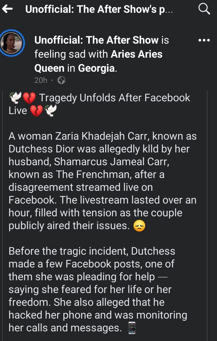 A woman identified as Zaria Khadejah Carr has allegedly passed away following a disagreement with her husband that occurred during a Facebook livestream.
