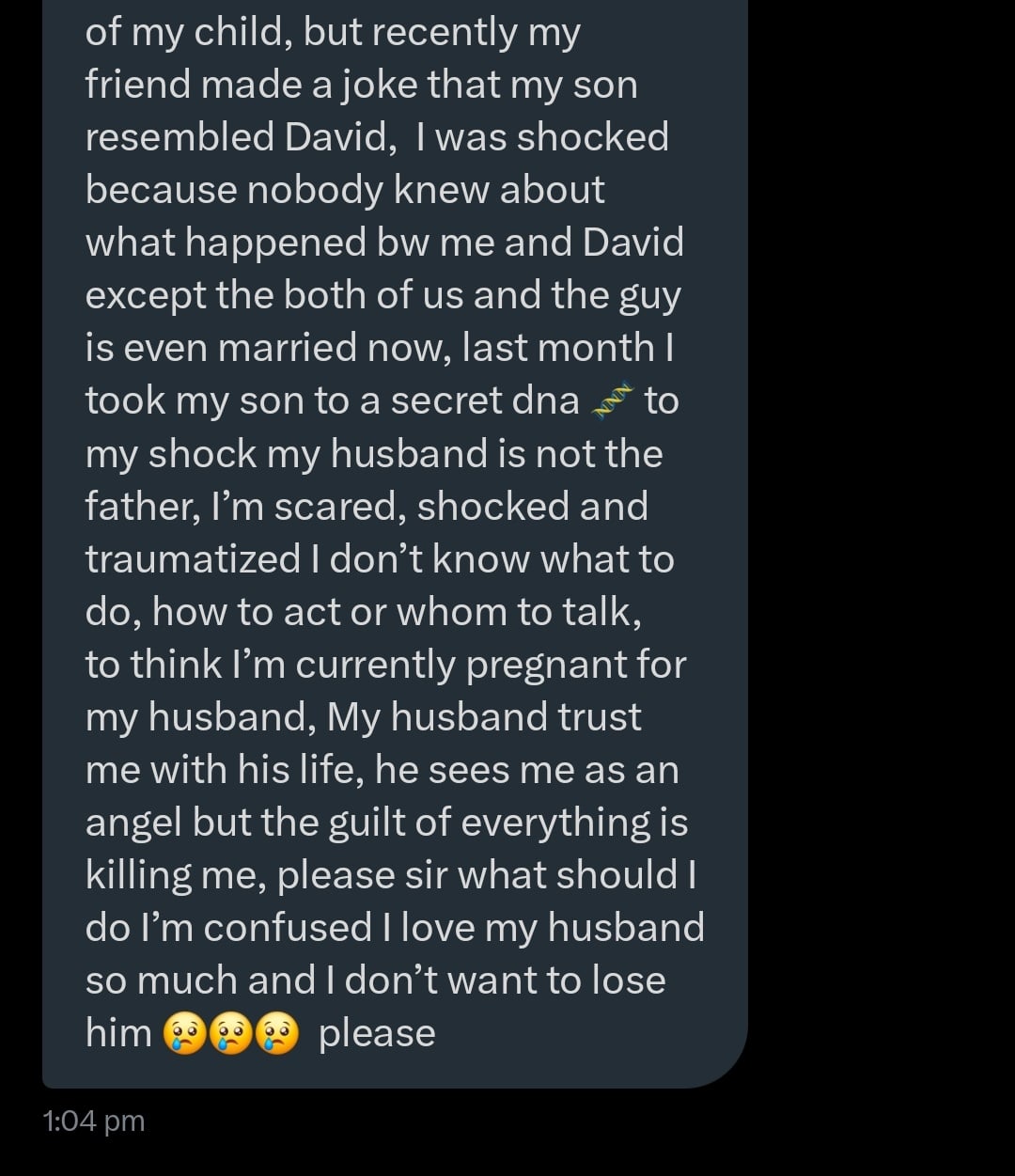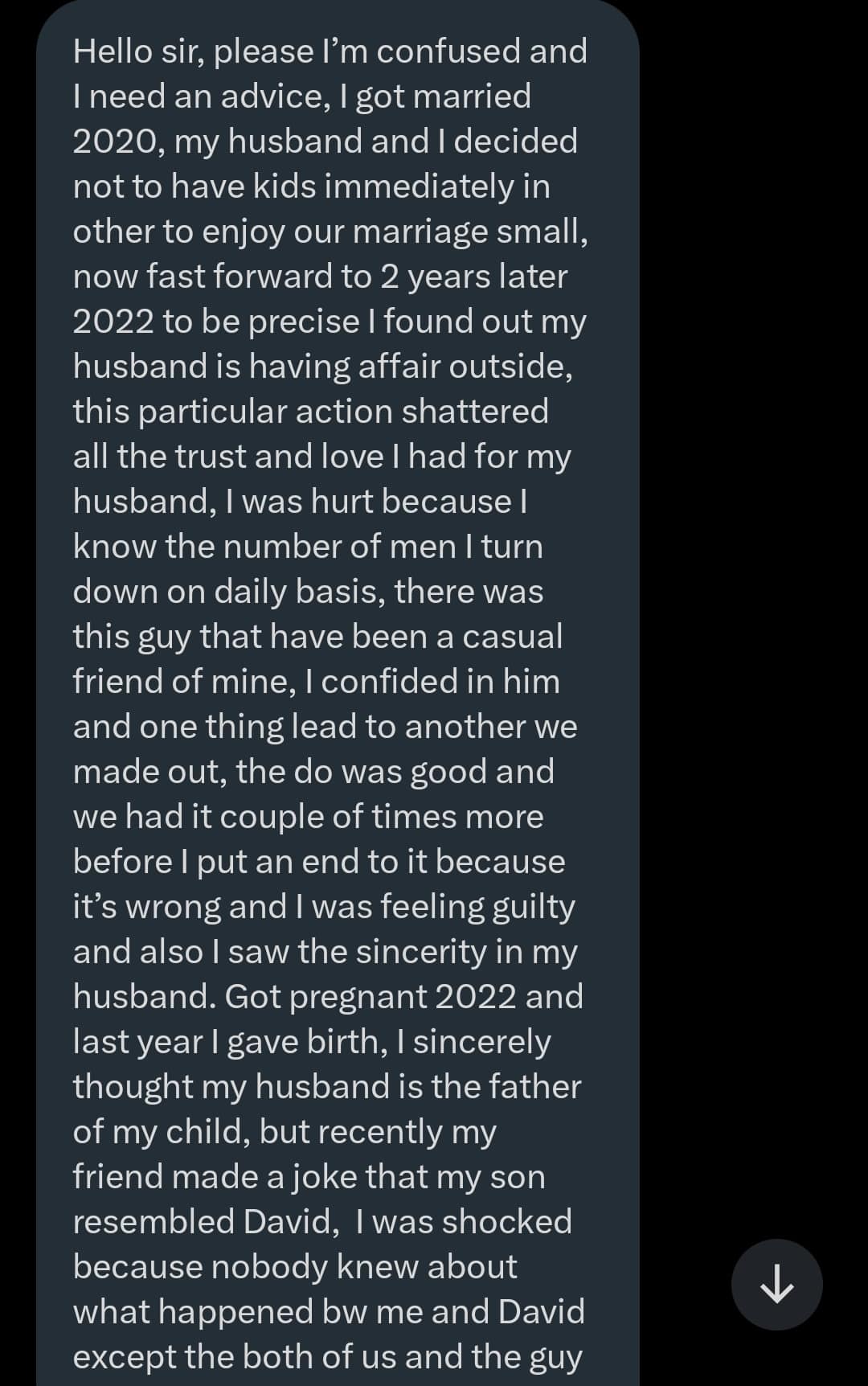 “I was shocked because nobody knew about what happened bw me and David except the both of us and the guy is even married now, last month I took my son to a secret dna to my shock my husband is not the father.”