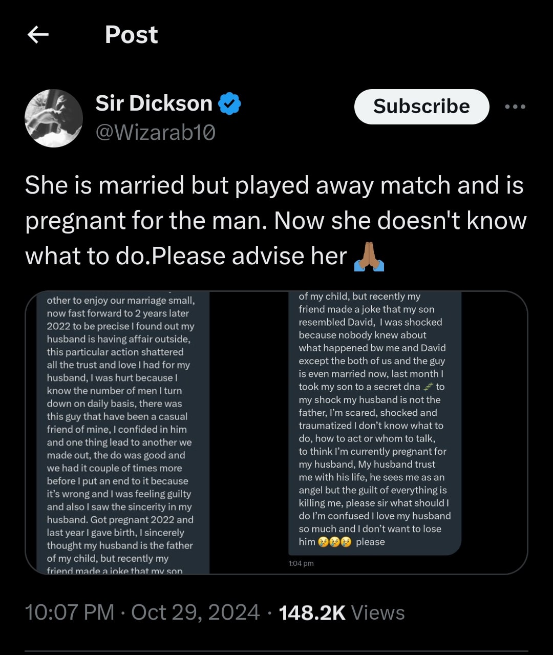 A wife recently turned to social media for help after discovering that the man she had an affair with two years into her marriage is the biological father of her child, not her husband.