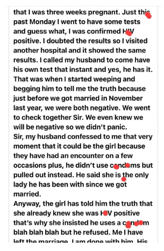 Anyway, the girl has told him the truth that she already knew she was I-OV positive that’s why she insisted he uses a blah blah blah but he refused. Me I have left him in the marriage.”