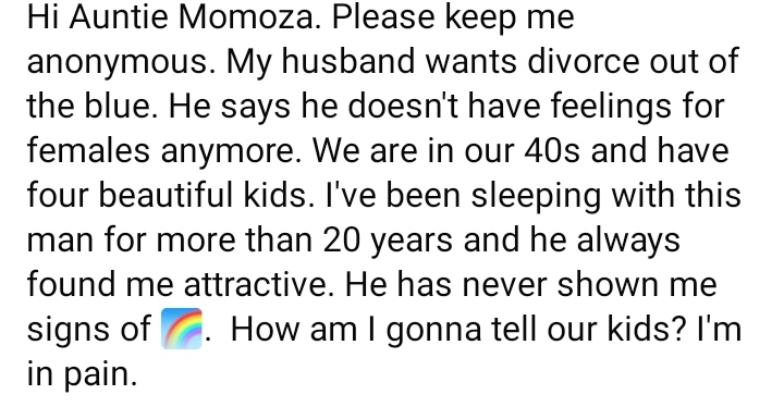 “Please keep me anonymous. My husband wants divorce out of the blue. He says he doesn’t have feelings for females anymore. We are in our 40s and have four beautiful kids. I’ve been sleeping with this man for more than 20 years and he always found me attractive. He has never shown me signs of 🌈. How am I gonna tell our kids? I’m in pain.”