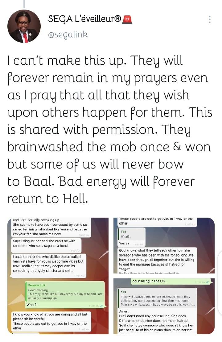 Reading the screenshot of the conversation posted; the man had warned Segalink to be careful as there are many people who are out to get in his way. The people he referred to are the ones influencing his wife and other women out there and they are online feminists.