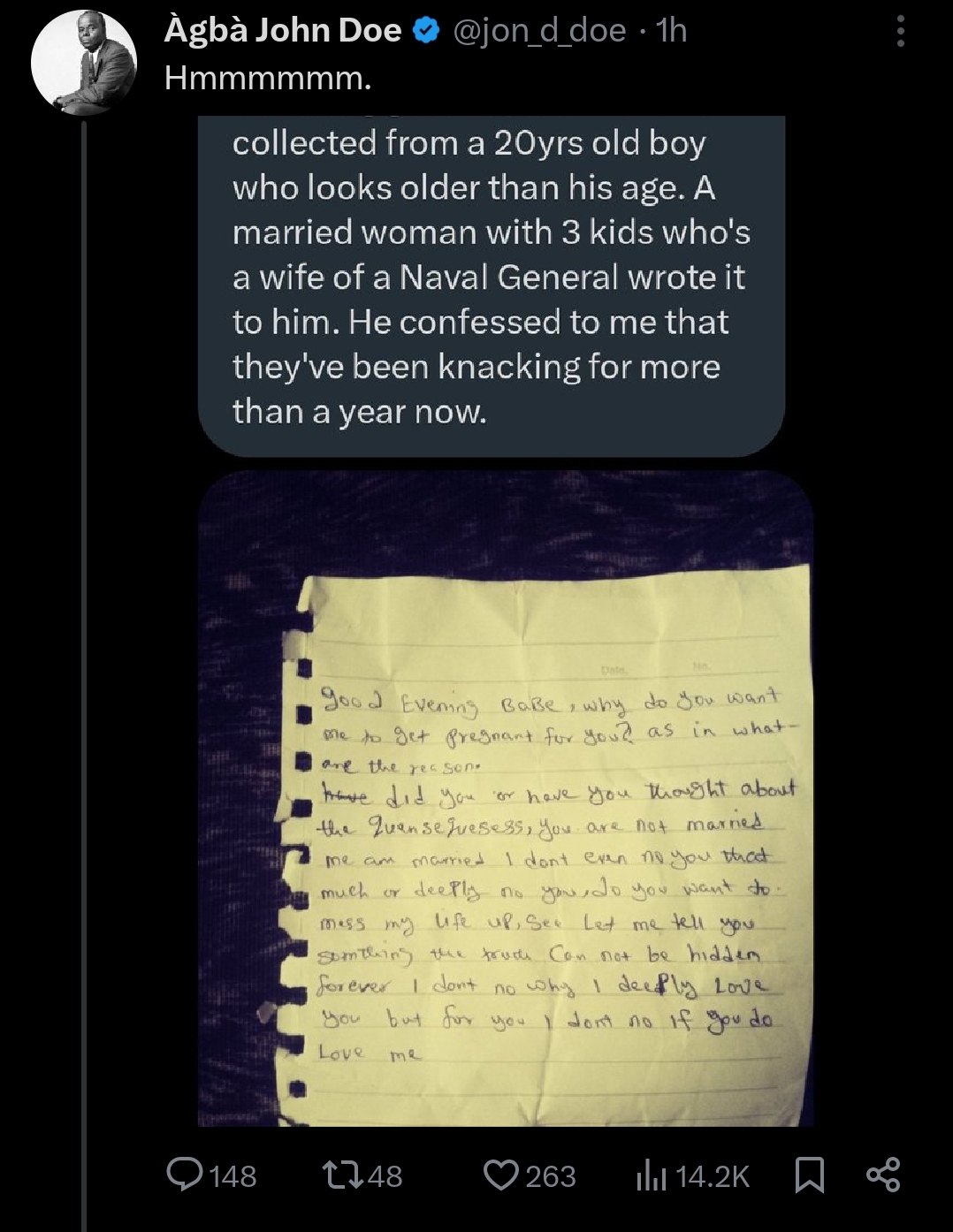 A love letter allegedly written by the wife of a naval officer with three children to a 20-year-old boy has surfaced on social media, sparking widespread reactions.