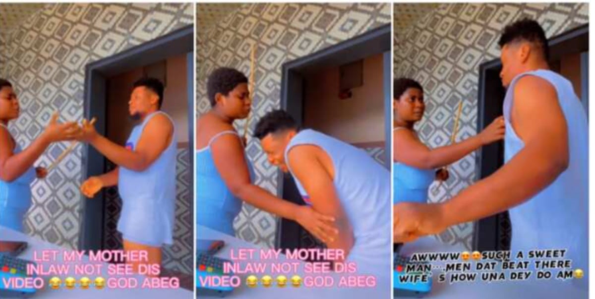 “I flogged my husband for not telling me he is going out yesterday night. See his reaction… Men that beat their wives, how far? Are you guys normal at all? See my sweet man smiling and collecting cane…”