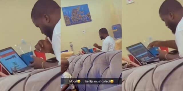 While the lady, whose face was not shown in the video, was ranting, the face of the man was revealed as he was seen surfing betting websites like Bet9ja and SportyBet.